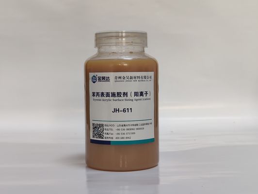 JINHAODA JH-611のカチオンのスチレンのアクリルの表面のサイジング代理店はペーパー表面の処置のための優秀な特性が付いている薄茶の液体である。それはアクリレイトの共重合体で構成されるカチオンのスチレンのアクリルの表面のサイジング代理店で水で溶ける。代理店は優秀な分散、防水およびぬれた強さの特性を提供し、0-40℃の温度で安定している。